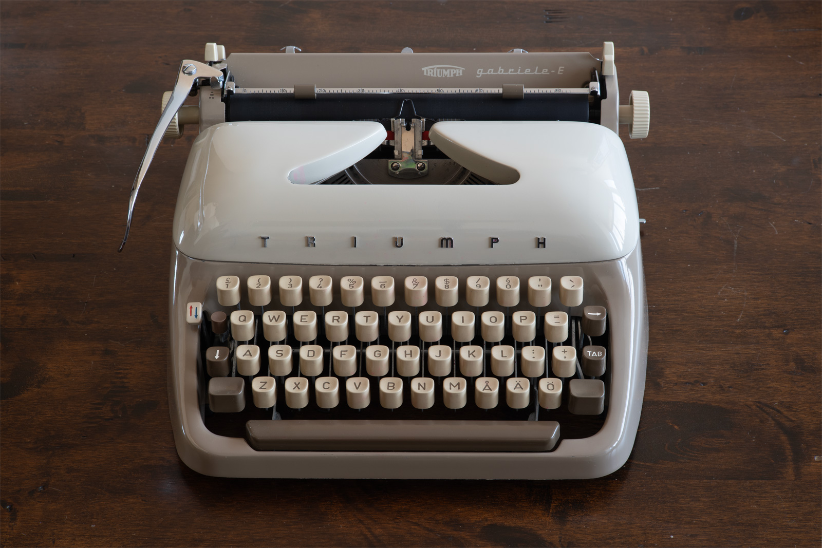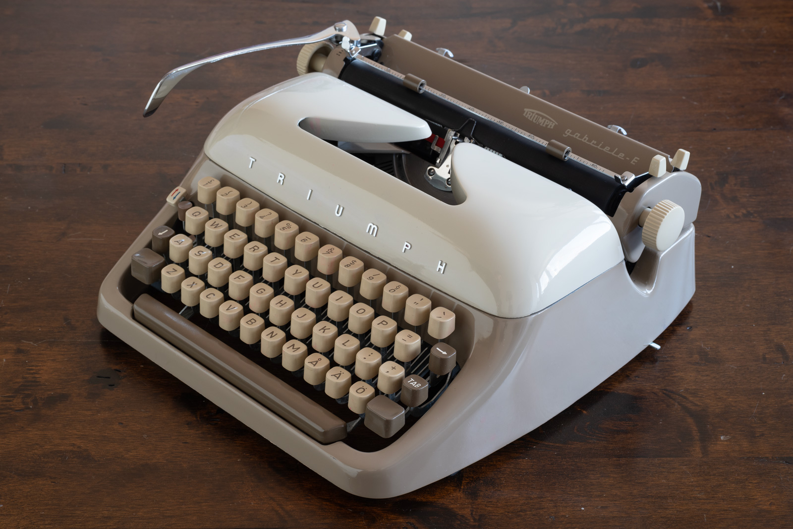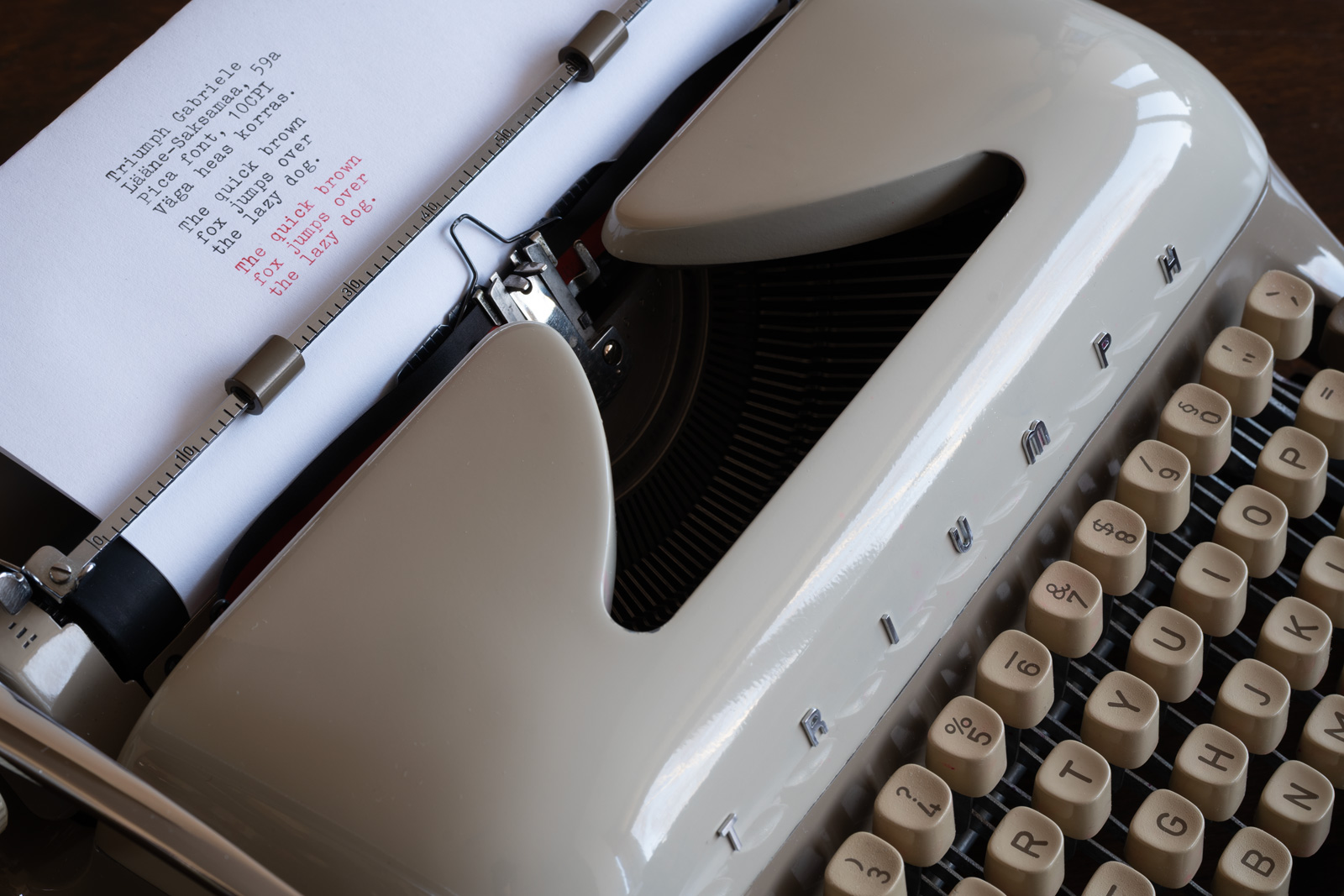 Tootja: Triumph Mudel: Gabriele Toodetud: 1959. aastal. Lääne-Saksamaa. Font: Pica, 10 märki tolli kohta. Seisukord: Väga heas korras.