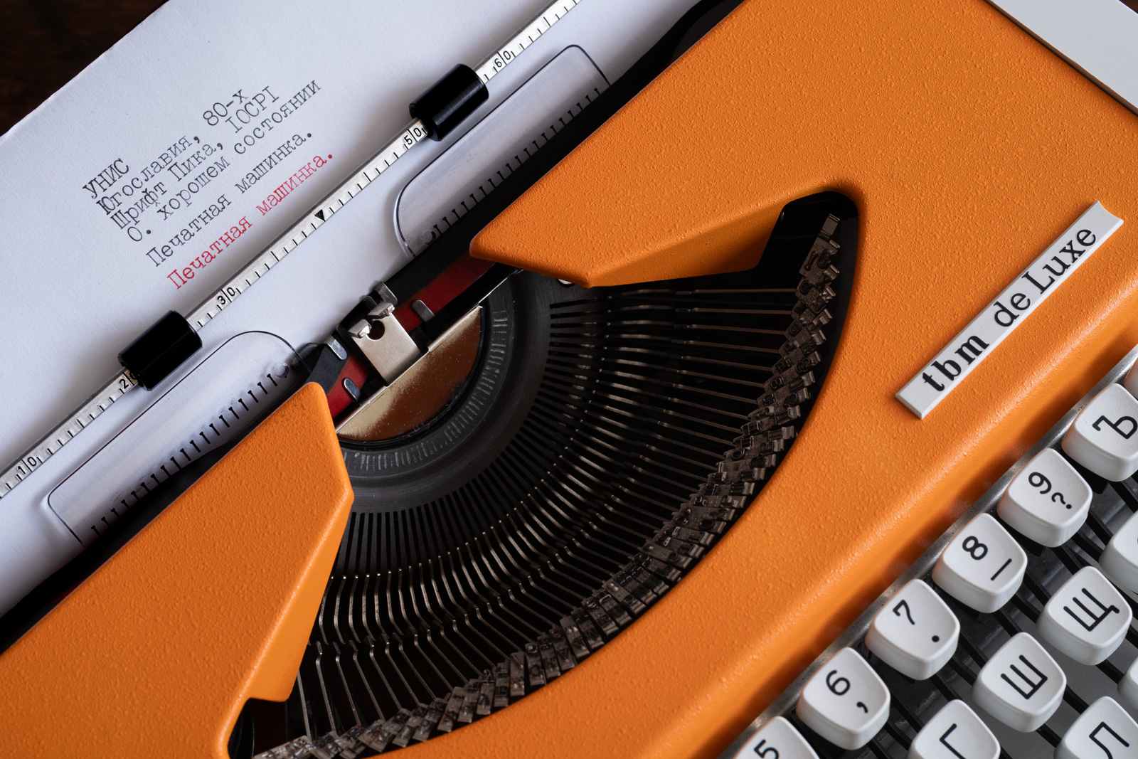 Tootja: UNIS Mudel: Tbm de luxe Toodetud: 80′ aastatel. Jugoslaavia. Font: Pica, 10 märki tolli kohta. Slaavi. Seisukord: Väga heas korras.
